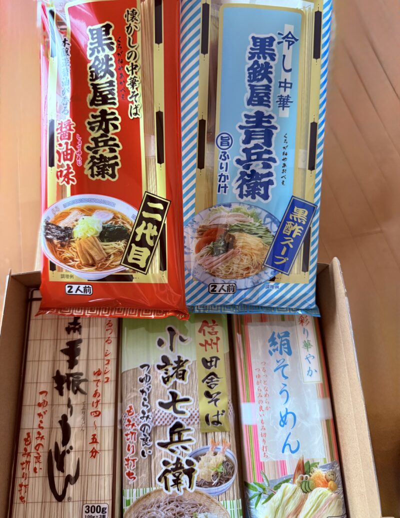 7月18日に乾麺つめあわせセットが届きました。ラーメン、冷やし中華、そうめん、うどん、蕎麦のセットです。
