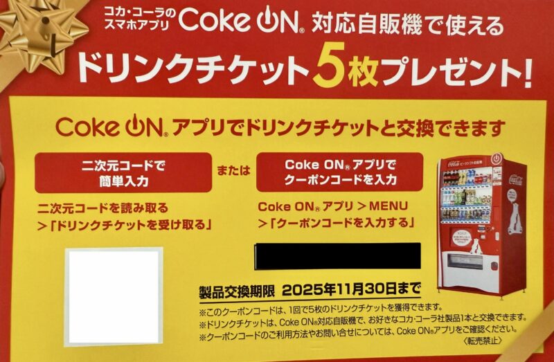使い方は、コークオンアプリをインストールして、メニューから「クーポンコードを入力する」の画面から記載されているコードを入力します。