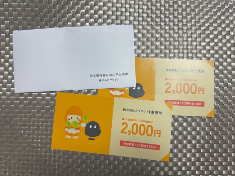 2025年9月12日、クラダシ Kuradashi ギフト4,000円(2,000×2)のクーポンコードが届いた(2025年6月末分)。